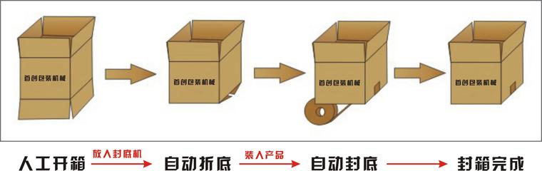 该款SCGPK-40S自动折底封底机设备体积轻巧,重型自带刹车脚轮相辅,移动极其灵活,不需调试,只要纸箱规格符合使用范围便可直接使用。使用方法:人工将纸箱撑开,手动将纸箱底部两片纸板折下,放至半自动封底机上面(左右摆下即可折下),当纸箱触碰到半自动封底机的开关后,设备会自动将纸箱另外两片纸板自动折起来,这时候纸箱是静止不动的,您可以往纸箱里面放入包装物,然后再踩一下脚踏开关,设备的气动推料部件,便会自动将纸箱推动进行自动封底,封完后即可搬下纸箱。