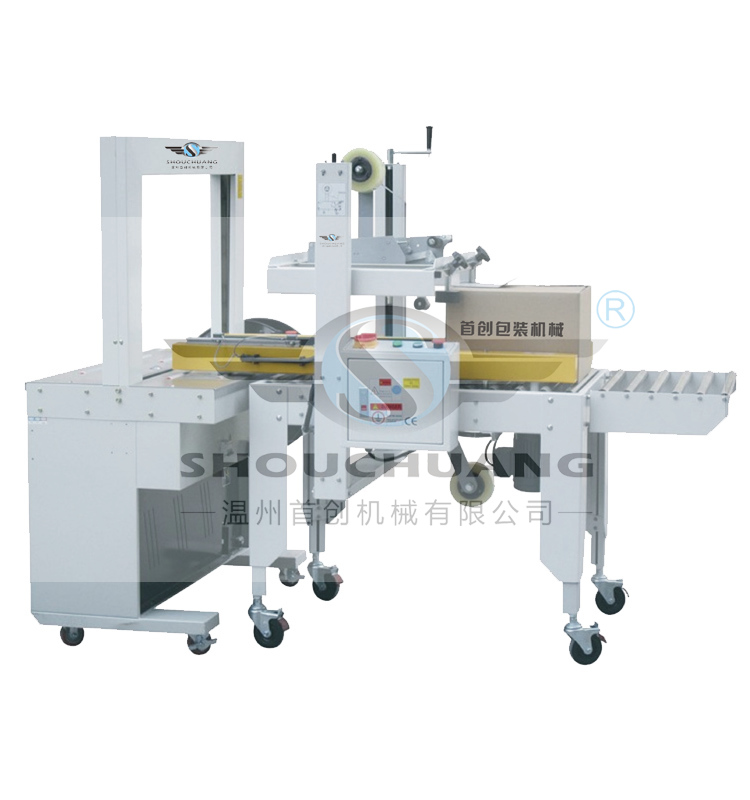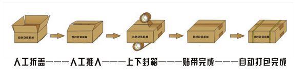自动封箱打包机是一种集自动封箱及打包为一体的包装机,可配套自动化包装流水线使用,自动上下封胶带、多道打包,实现后道无人化包装。工作效率高。本条生产线的生产流程为:人工把纸箱底部折好,放到封箱机工作台板上面,然后往里面装产品,人工把纸条上盖折好,然后推入至封箱机,由封箱机皮带输送进去,进行上下同时封箱,封箱完成后,由封箱机两侧输送台,把纸箱输送至全自动打包机当中,全自动打包机感应到纸箱过来的,便自动打包,第一道打包完成后,设备会自动把纸箱输出一定距离,然后进行第二道打包,然后再输送出去,打包便完成。