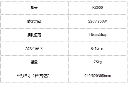 KZ900型半自动聚乙烯塑料带为捆扎材料、主要用于商业、邮政、铁路、银行、食品、医药、书刊、发行等行业的纸箱、木箱、纸包件、柳编箱、布包件的包装捆扎。在插入包装带后,机器能自动完成聚带、百叶窗、热合、切断并出带、且装有自动停机之功能。工作速度快、效率高、省时省力、打包质量高。